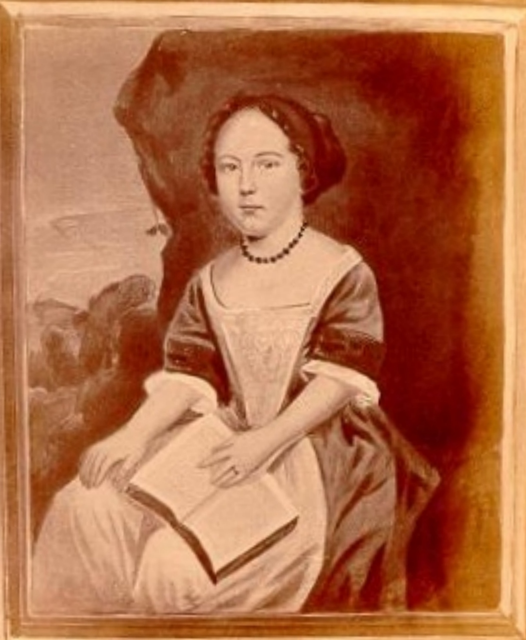 You have all seen and admired a portrait belonging to me, of a young girl in antiquated dress, sitting under a vine-covered and moss-grown bank, with a Latin Prayer-Book open in her hand. This is a portrait of Martha Barker, taken when she was thirteen years old, daughter of Samuel Barker, gentleman, of the county of Derby, England. This portrait was presented to me by my grandmother Harrison in 1834. It was sent to America at a very early period, and remained in possession of her father, Thomas Bowlby, son of Martha Barker. There once existed in the family a portrait of Thomas Bowlby, the husband of Martha Barker; but it, in some way, was lost after the death of my great-grandfather Bowlby.Martha Barker was born in the county of Derby, England, about the year 1671, and died in 1751. She married Thomas Bowlby, of Mansfield-Wood House, saddler, in the county of Nottingham, England, and by him had six sons, named, respectively, Samuel, Jordan, George, Thomas, Richard, and John; and three daughters, named Elizabeth, Martha, and Jane.